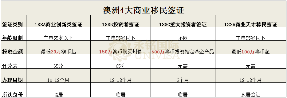 我們先通過下圖簡單了解下澳洲四大商業(yè)移民類別:188A商業(yè)創(chuàng)新簽證、188B投資者簽證、188C重大投資者簽證和132商業(yè)天才簽證。下文我們就這四大商業(yè)移民簽證居住要求大起底!