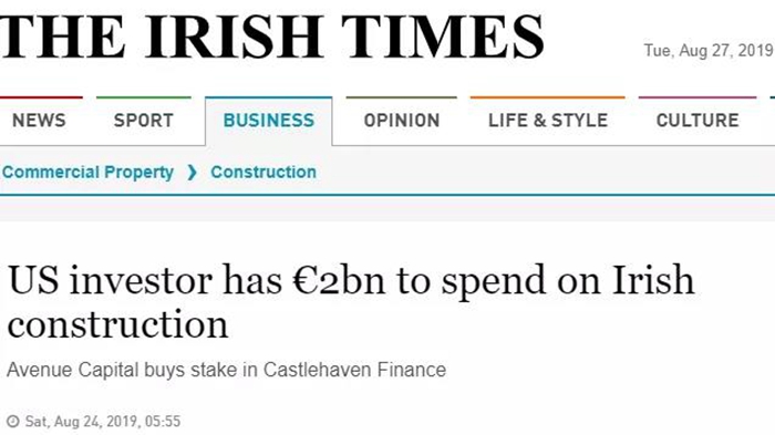 另一邊,美國全球投資公司Avenue Capital Group預計會在未來四年內斥資20億歐元進駐愛爾蘭的住宅和商業建筑。