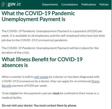 愛(ài)爾蘭福利局為所有因疫情而失去收入的員工或自雇人士每人每周發(fā)放350歐元,共計(jì)發(fā)放6周的基本補(bǔ)助金。申請(qǐng)?jiān)撗a(bǔ)助不會(huì)對(duì)簽證造成影響。社會(huì)保障部部長(zhǎng)Regina Doherty表示已經(jīng)處理了超過(guò)40,000份失業(yè)救濟(jì)金的申請(qǐng),將在下周支付給申請(qǐng)者。