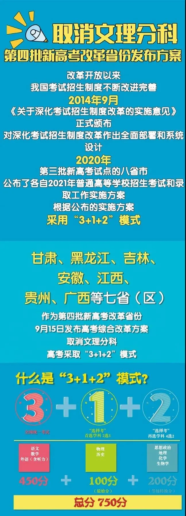 此外,學生可以結(jié)合自身特長興趣選擇剩余的3門考試科目:首先在物理和歷史中選擇1門,再從思想政治、地理、化學、生物學中選擇2門。由此組成“3+1+2”模式,6門科目的滿分為750分。