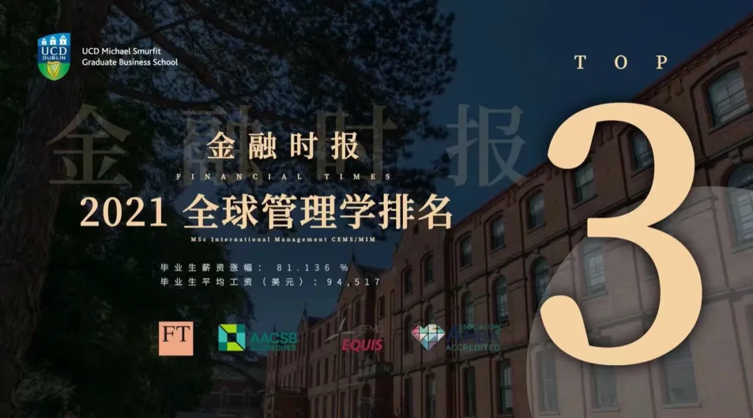 據(jù)英國《金融時(shí)報(bào)》公布的最新商學(xué)院排行榜,都柏林大學(xué)(UCD)Smurfit商學(xué)院的全日制國際管理碩士課程被評為全球第三佳課程,這是該專業(yè)連續(xù)第四年躋身全球前十,比去年的第八名又躍升了五位。