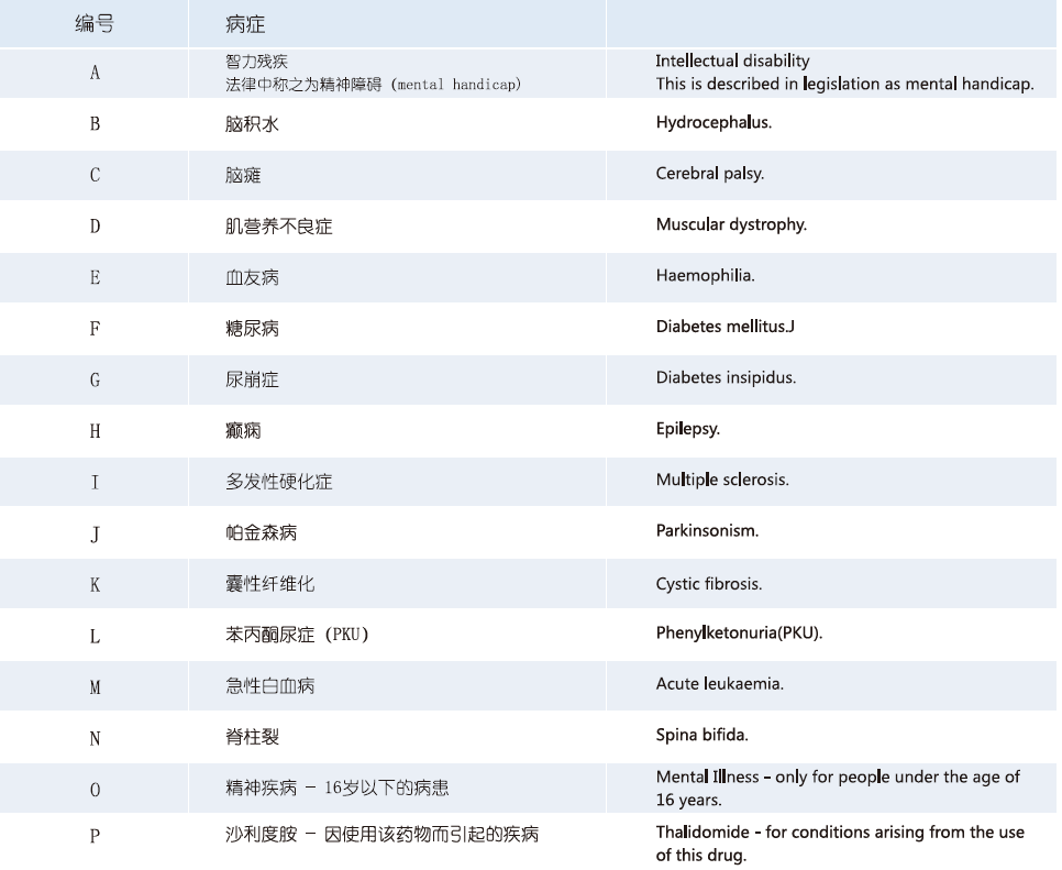 為患有某些長期疾病或身心殘疾的愛爾蘭居民提供免費的疾病治療,包括藥品、藥物、醫(yī)療和外科手術(shù)。該計劃的申請不以申請人的收入情況為評定條件,而是病史。符合“長期疾病醫(yī)療計劃”的疾病類型如圖所示: