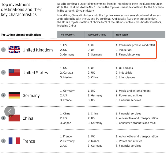 根據世界權威會計師事務所安永(EY)最新出爐的一系列數據和排名顯示,英國并沒有受到脫歐疑云籠罩,全球投資者依然對英國充滿信心。