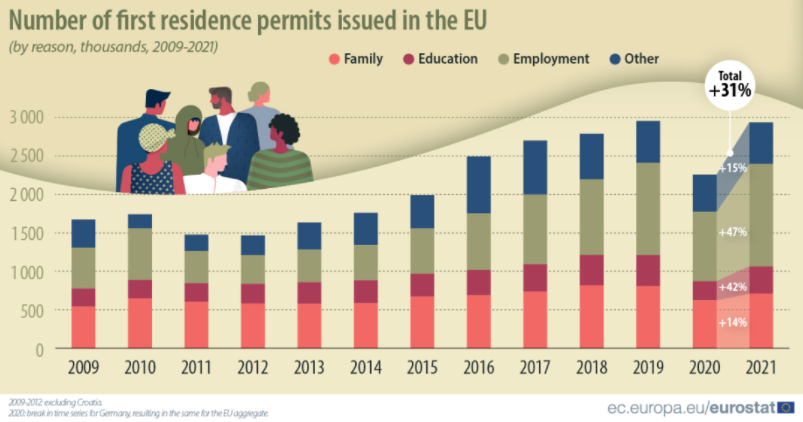 歐盟統計局發布的最新報告顯示,2021年歐盟向非歐盟國家公民簽發了近300萬張首次居留許可,簽發量與2020年相比飆升31%,重回疫情前2019年水平。