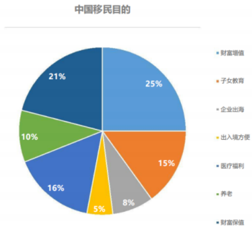 從移民需求來看,財產增值成為了目前最主要的移民原因,占比高達25%。其次是醫療福利占比21%;財富保值占比16%;子女教育占比15%;養老需求占比10%。