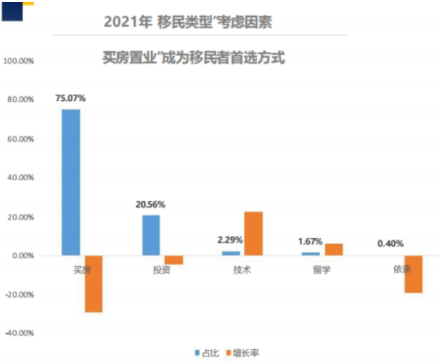 目前,移民市場上有很多種移民方式,投資移民、購房移民、技術移民、留學移民、親屬移民等等。在各種各樣的移民方式中,購房移民(占比75.07%)和投資移民(占比20.56%)是最便捷、最受歡迎的移民方式。通過海外購房或投資,不僅可獲取海外身份,還可實現資產分散配置、財富保值增值。