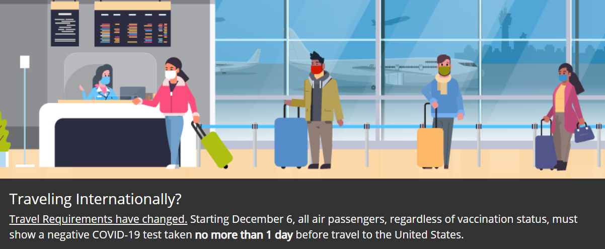 從12月6日起,赴美旅客需在完全接種(即全劑量接種滿14天整)后,憑疫苗接種憑證和登機前一天內(此前為72小時內)新冠病毒檢測陰性證明登機。注意,這里的提前一天并不代表必須在起飛前24小時進行檢測。如果旅客的航班是周五,可以帶著在周四任何時間段進行的病毒檢測陰性證明登機。