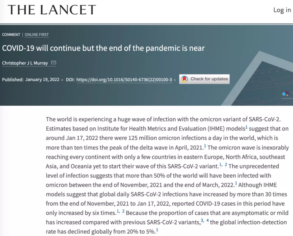Omicron的肆虐讓大家惶惶不安,疫情已進入第三個年頭,大家都翹首盼望著疫情早日終結(jié),回歸正常生活的一天。好在近日,全球最著名的醫(yī)學雜志之一《柳葉刀》給我們帶來了好消息:大流行即將結(jié)束,關(guān)鍵節(jié)點是3月底。