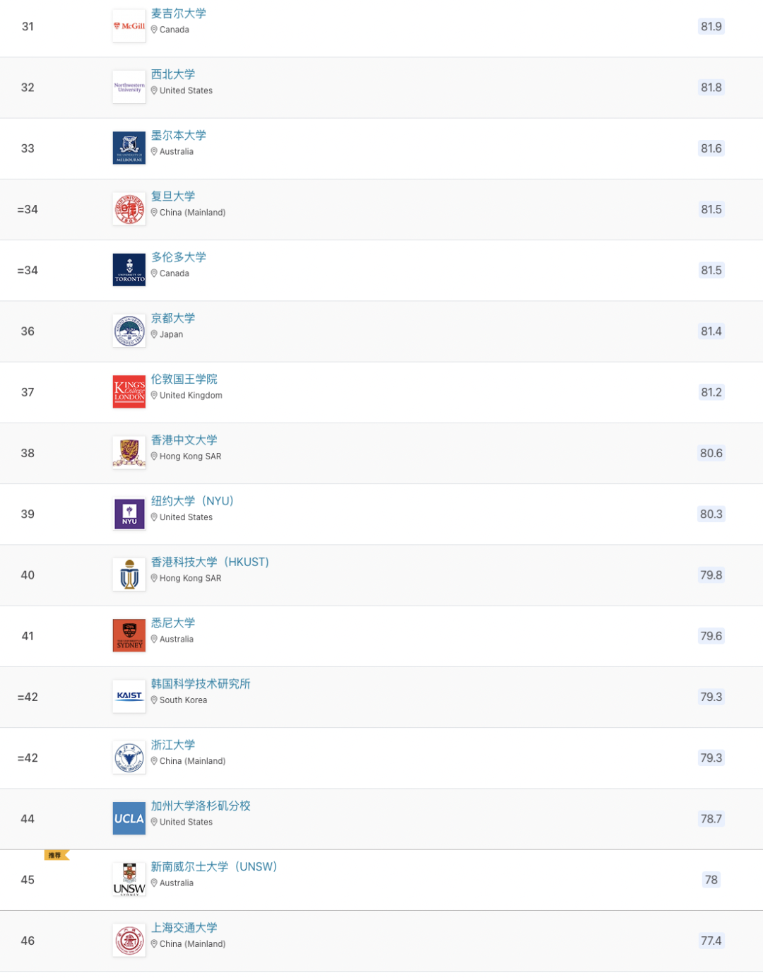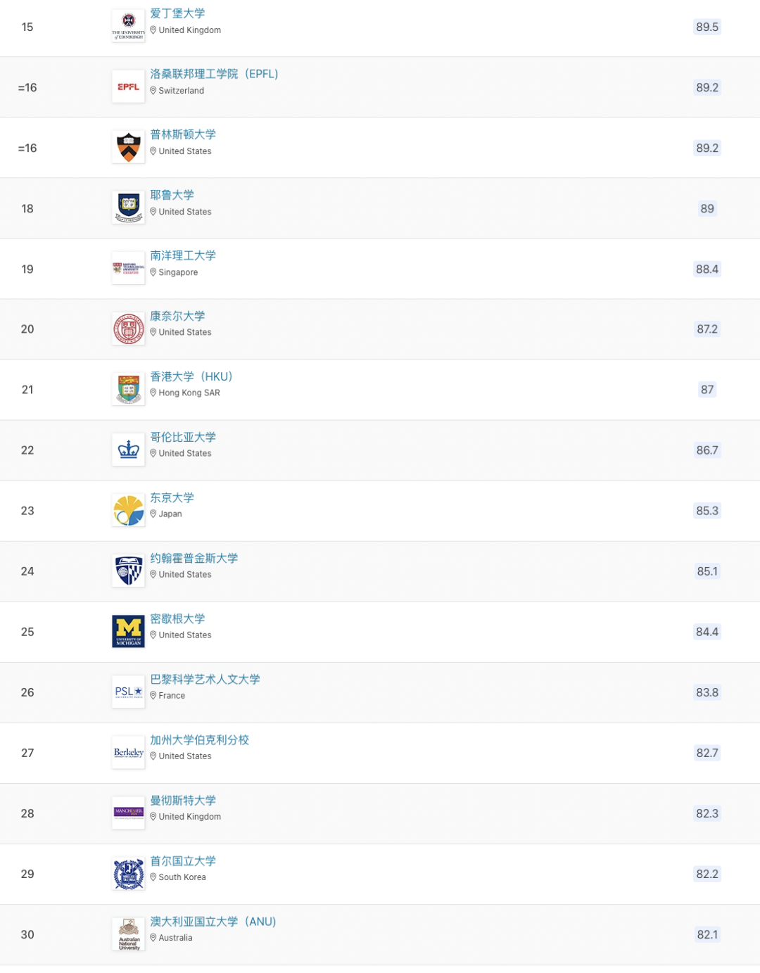 以下為世界前100所大學排名: