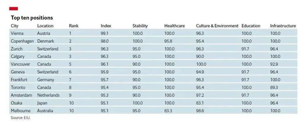 近日,英國經(jīng)濟(jì)學(xué)人智庫發(fā)布了“2022年全球最宜居城市”排行榜。