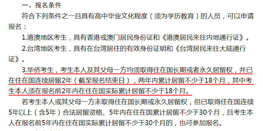 考生本人及其父母一方均須取得住在國(guó)長(zhǎng)期或者永久居留權(quán),并已在住在國(guó)連續(xù)居留2年(截止報(bào)名結(jié)束日),2年內(nèi)累計(jì)居留不少于18個(gè)月,其中考生本人須在報(bào)名前2年內(nèi)在住在國(guó)實(shí)際累計(jì)居留不少于18個(gè)月。