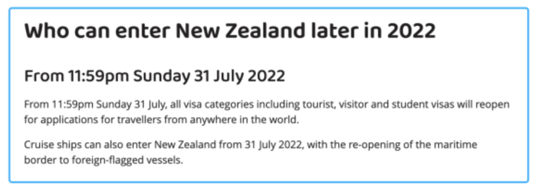 當(dāng)?shù)貢r(shí)間7月31日23時(shí)59分,因新冠疫情關(guān)閉了兩年多的新西蘭邊境對(duì)所有游客和國(guó)際學(xué)生全面開放,海上邊界也將重開。這一消息意味著:除新西蘭公民、居民以及澳洲公民之外,只要持有有效簽證的人都可以入境新西蘭。國(guó)際學(xué)生和游輪的回歸,將為教育和旅游業(yè)提供急需的經(jīng)濟(jì)動(dòng)力。注意,入境前需提供獲新西蘭政府認(rèn)可的新冠疫苗完全接種證明。